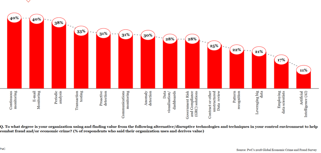 Underlying the point of adoption of emerging technologies in large firms, PwC conducted a survey of 7,300 respondents in 123 territories with the majority of respondents being senior executives. The results showed that continuous monitoring of network and email for security is showing the greatest adoption at 40% of respondents utilizing the tech. Anomaly detection, proactive detection of threats and data dashboards all have around 30% adoption and are a critical component of an analytics focused company. The leading edge is using data scientists and AI (with 17% and 11% adoption respectively) to use big data to solve ranges of issues to combat fraud, advance automation projects and streamline operations and workflows.